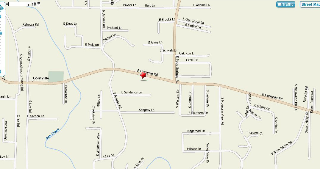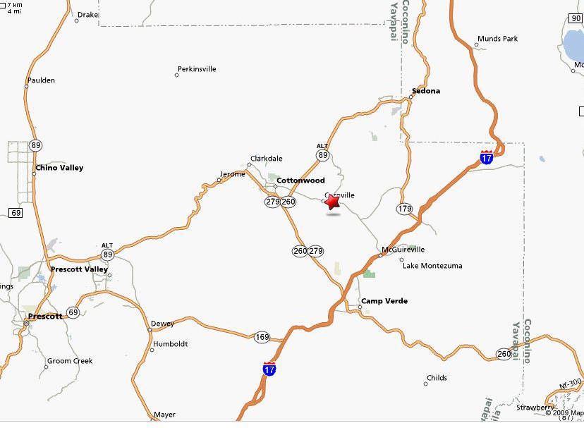 From Sedona: Go SOUTH on AZ-89 ALT S/SI BIRCH MEMORIAL HWY 17.1 mi. Turn LEFT onto CORNVILLE RD/E MINGUS AVE/CR-30. Continue to follow CORNVILLE RD/CR-30. 4.3 mi. End at 10990 E Cornville Rd Ste H Cornville, AZ